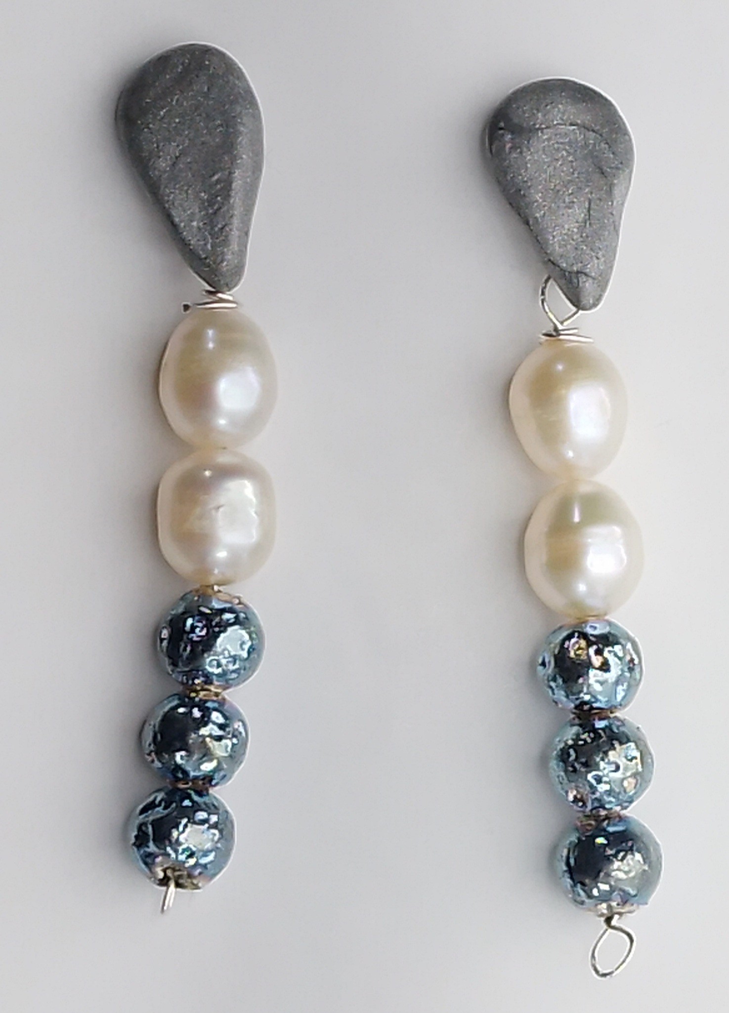 Brinco Pérola e Pedra Vulcânica, base formato Gota prateado, com pinos e tarraxas folheados a Prata.