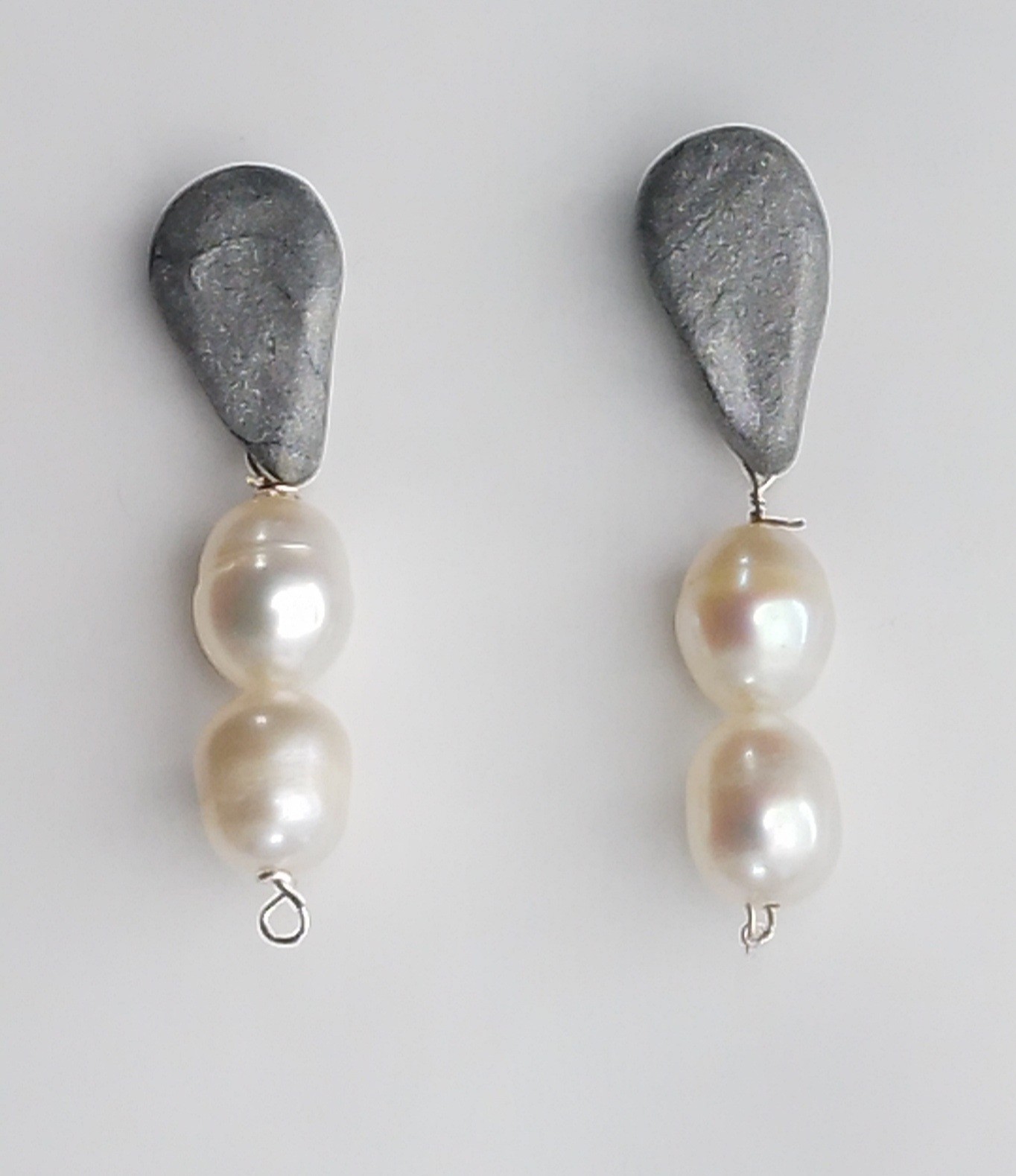 Brinco de Pérolas, base prata feita à mão em formato de gota, pinos e tarraxas folheados a Prata.