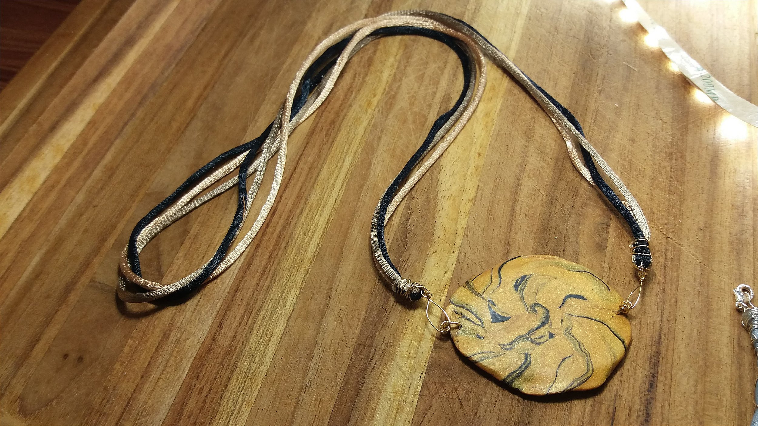 Colar feito à mão, com cerêmica plástica mesclada em Dourado e Preto, predominando a cor Dourada.