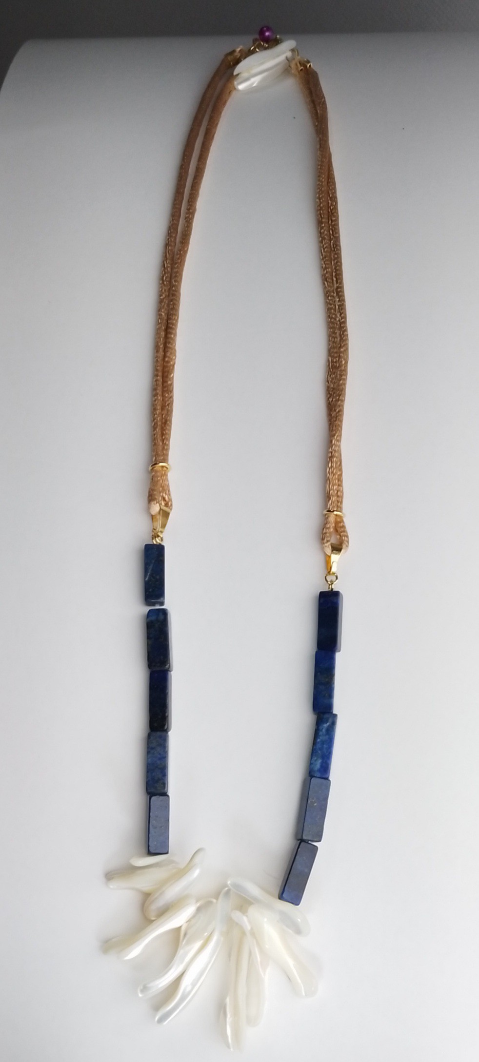 Colar feito à mão, Pedras Lapislazúli, Madrepérolas e acabamentos folheados a Ouro 18k.