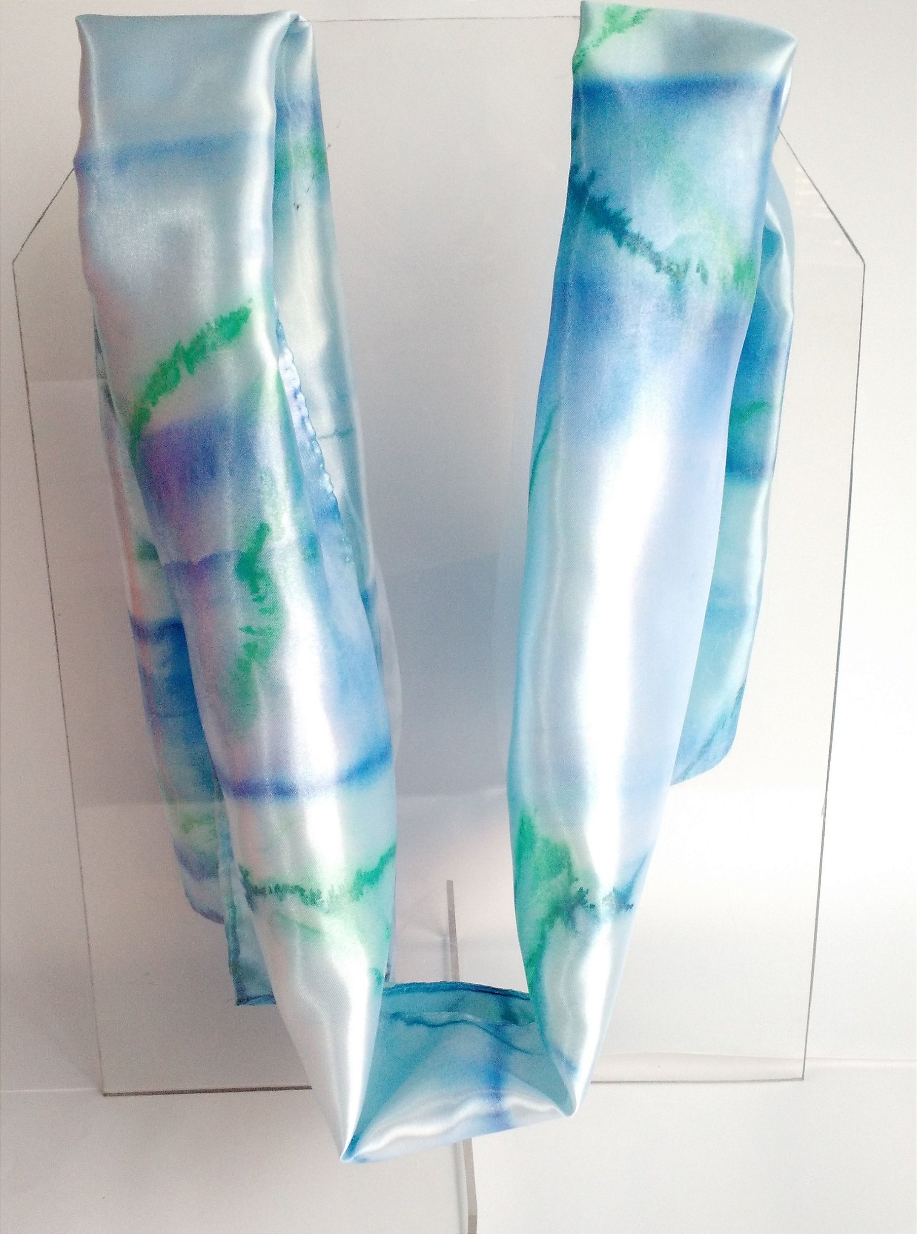 Lenço em Cetim Mar Azul à mão em tons azuis e verdes.