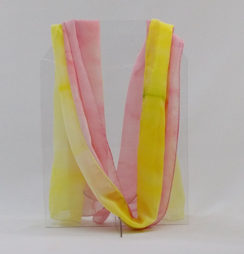 Lenço em musseline nas cores Amarelo, Rosa e suave detalhe em Verde.